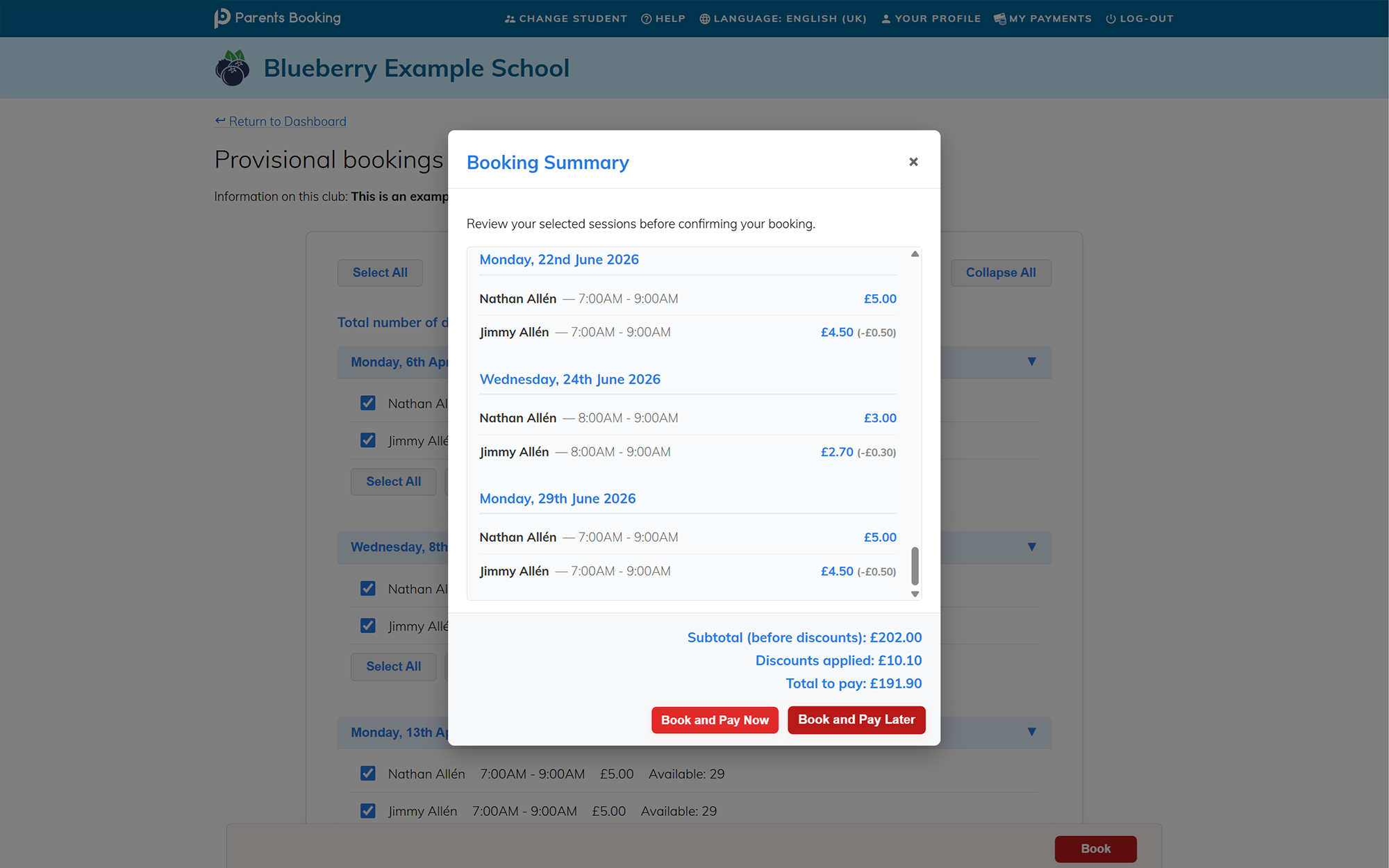 Our easy to use online booking system helps schools set up on-site and/or ‘virtual’ parents' evenings, tutor evenings, option evenings, student interviews, and more, so that parents can book their own appointments quickly and easily. Parents can also book all sorts of simple or complex clubs and events, from breakfast clubs to trips and everything in-between, and helping schools earn additional income.