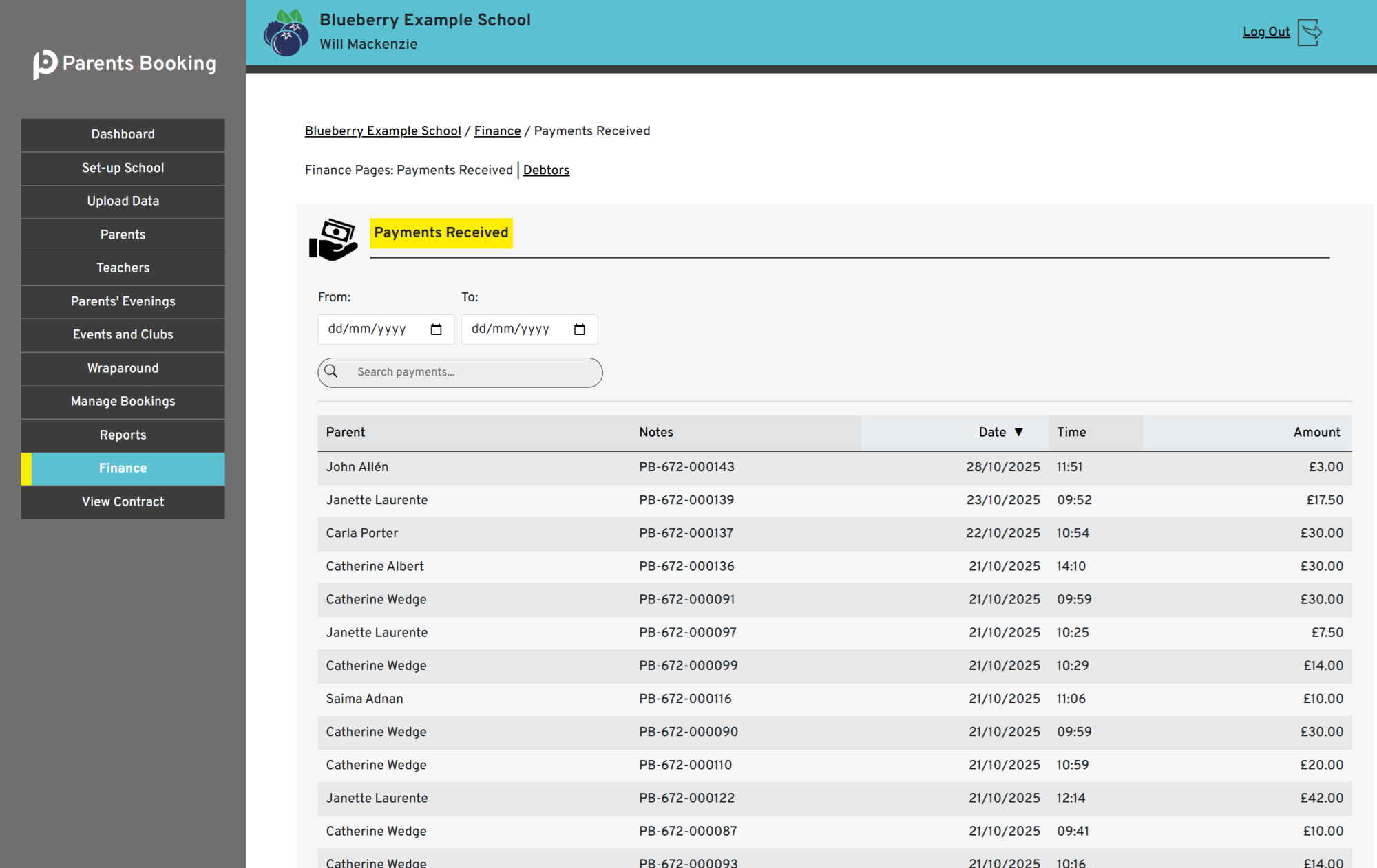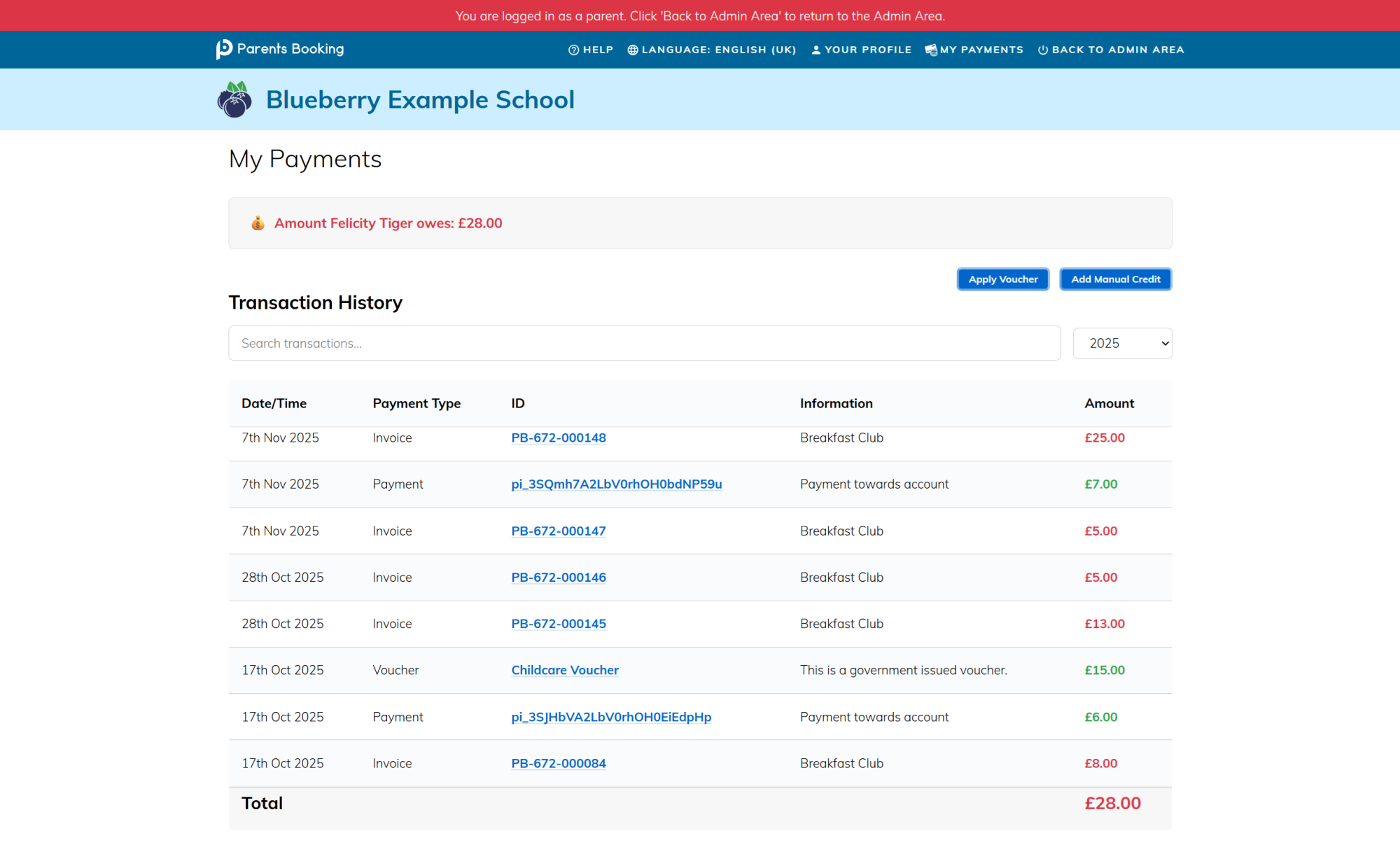 Each transaction has an invoice (or credit note) which parents can download or print, and schools can consolidate payments made using a Finance page in their admin area.
